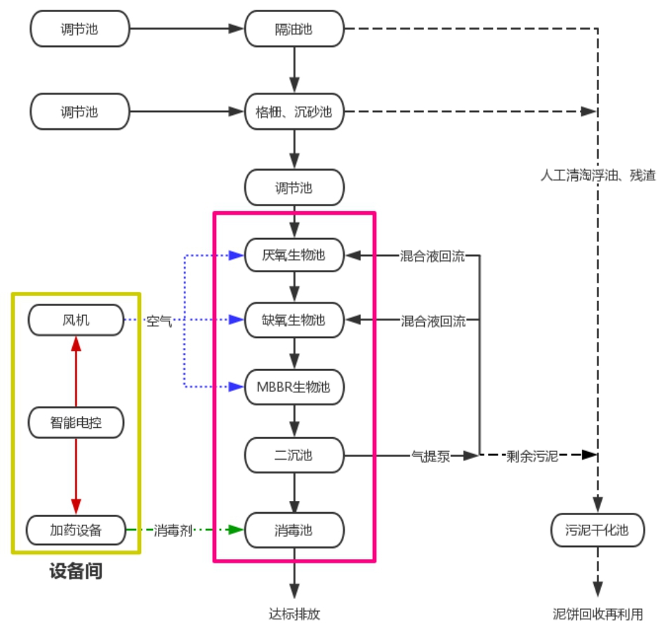 1 隔油池:廚房含油廢水排入隔油池,對污水進行隔油預(yù)處理,有助于后續(xù)處理工藝的正常運行;